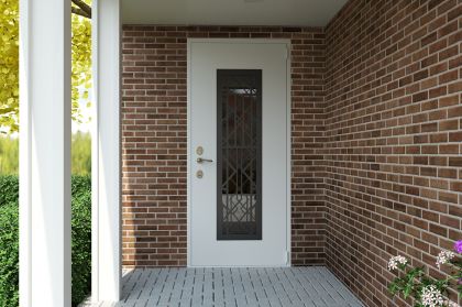 Стеклопакет во входной двери декорирован накладной решеткой, которая делает уместной входную дверь в проектах, выполненных в современном стиле.
