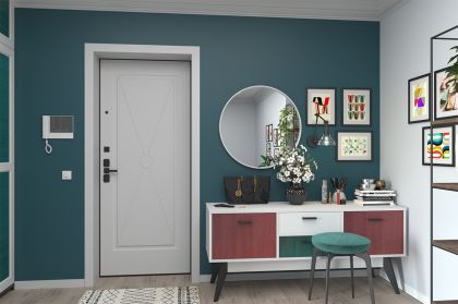 Белый цвет отделки «Альба» – классический цвет для интерьера в скандинавском стиле, традиционный и беспроигрышный. Чтобы прихожая выглядела уютно, в дизайн добавлены яркие акценты и черные контрасты, которые создают настроение, наполняют дом энергией и придают оригинальности.