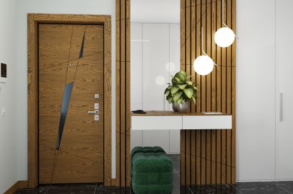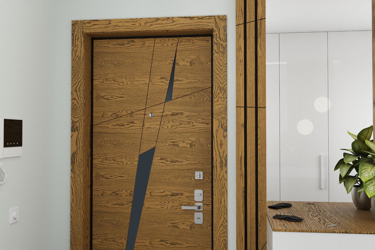 Входная дверь Гардиан с декоративной отделкой «Призма» из натурального шпона дуба с горизонтальной текстурой будет как раз кстати в современных интерьерах. А чтобы Ваш дизайн-проект бесспорно стал оригинальным и запоминающимся можно продолжить ассиметричные линии с отделки двери на деревянные рейки. Правильно подобранная цветовая гамма играет большую роль. Она не должна утяжелять помещение, а наоборот создавать иллюзию большого пространства.