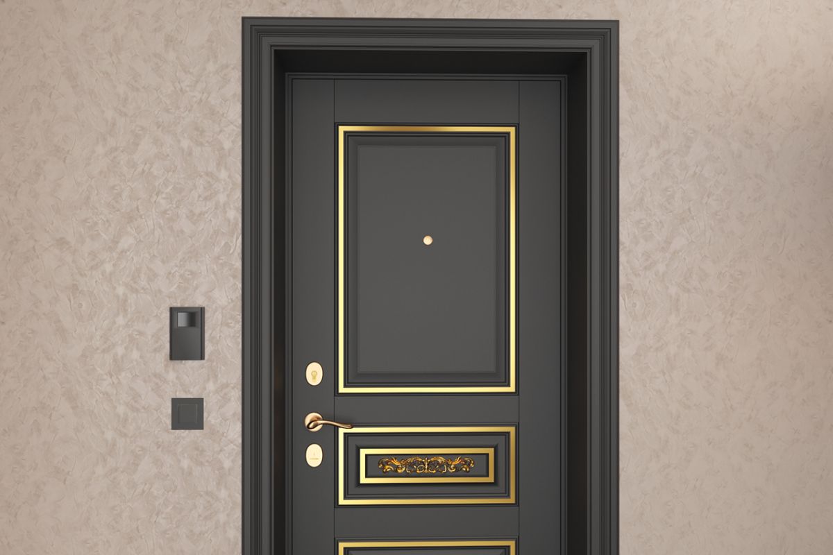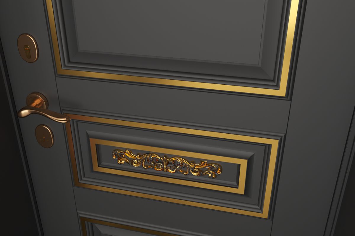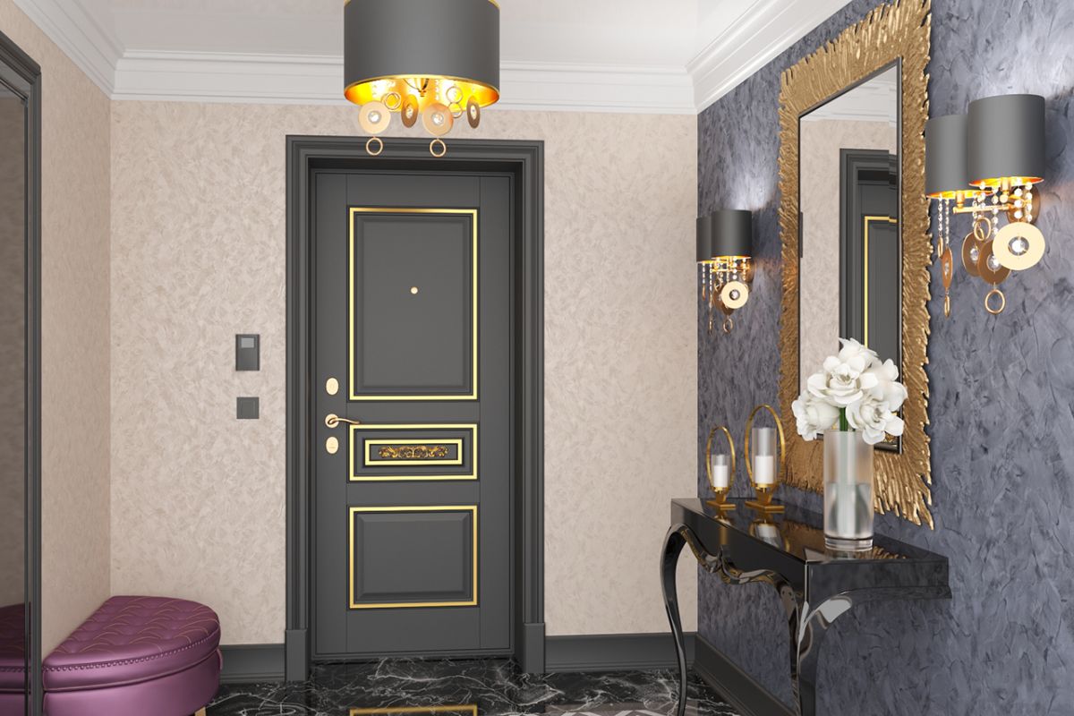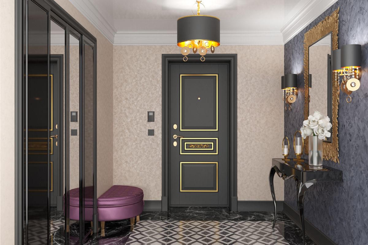 Фурнитура в цвете латунь или бронза завершит образ входной двери и дополнит сюжетную линию всего помещения, создав выразительное, но в то же время гармоничное пространство.