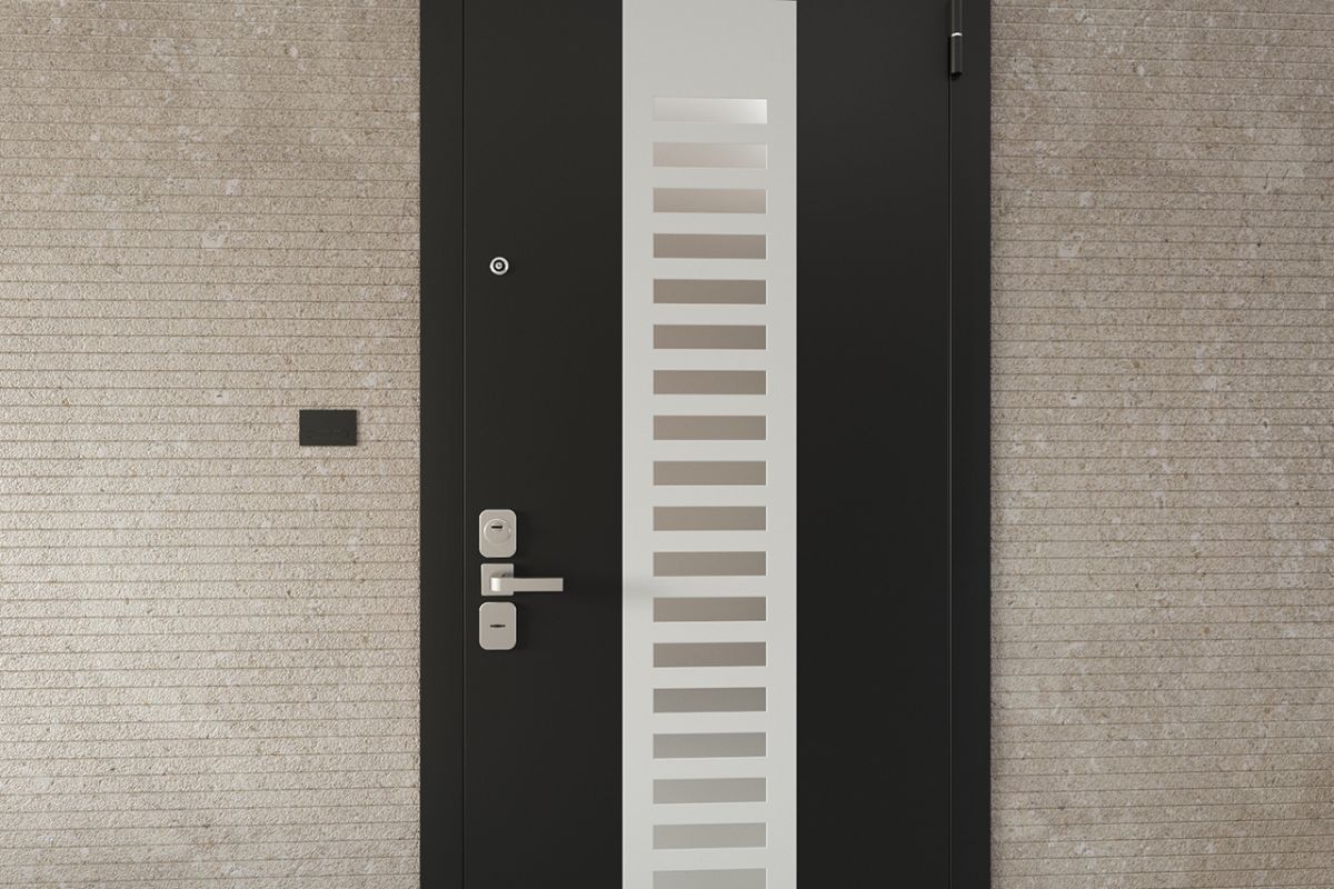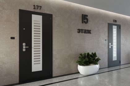 Стильный дизайн из строгих линий подчеркивает оригинальность внешнего вида двери. Отделка будет уместна как в современных интерьерах помещений многоквартирных домов, так и в местах общего пользования: бизнес-центрах, офисах и т.д. Главное условие, интерьер помещения должен быть выполнен в современном стиле с использованием натуральных материалов: камень травертин, дерево, стекло или мрамор, или с применением самых новых строительных материалов: фасадная штукатурка, облицовочных кирпич, керамогранит.