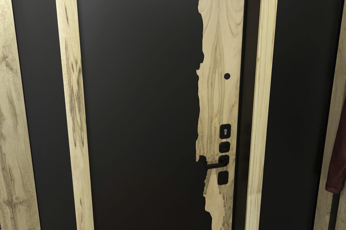 Благодаря своей черной основе и естественным оттенкам натурального шпона отделка из коллекции «Альберо» сделает входную дверь по-настоящему стильной и привлекательной.