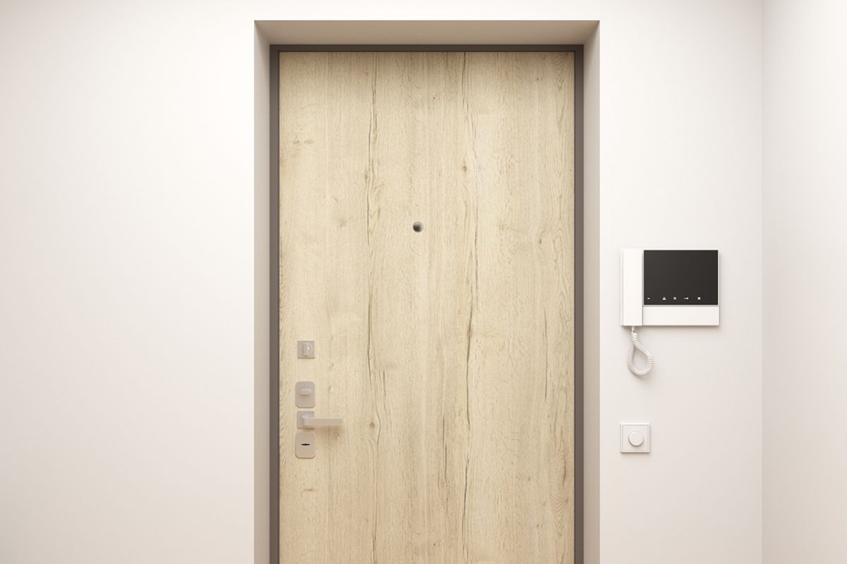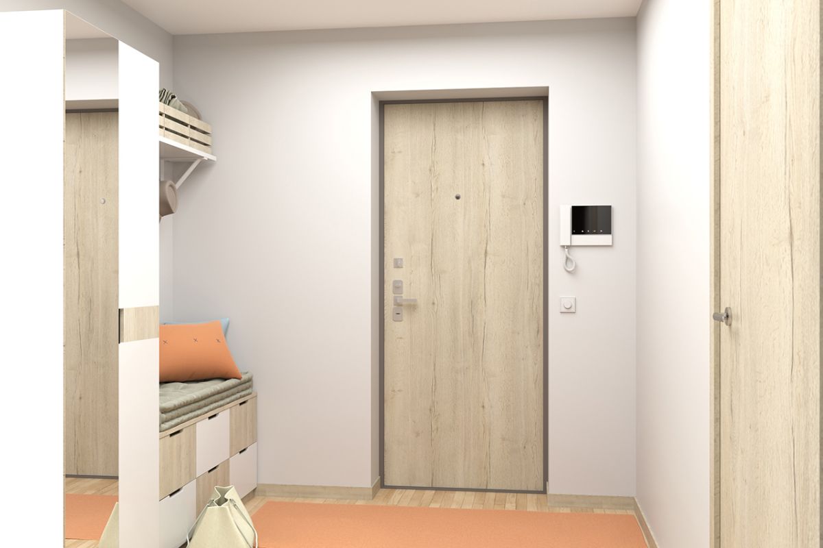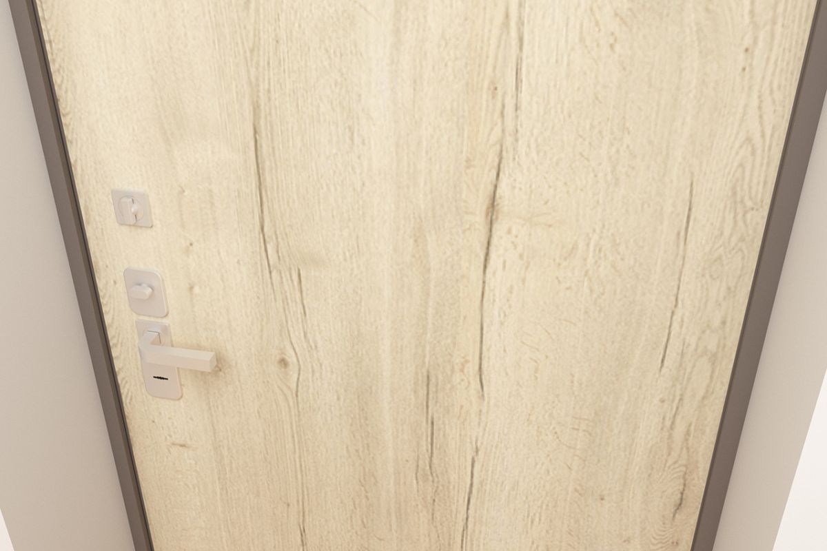 Отделка входной двери с вертикальным рисунком в популярных древесных оттенках, таких как «дуб табак», «дуб антрацит», «дуб светлый» придаст уюта и тепла помещению и выгодно подчеркнет интерьер, выполненный в современном минималистичном стиле.