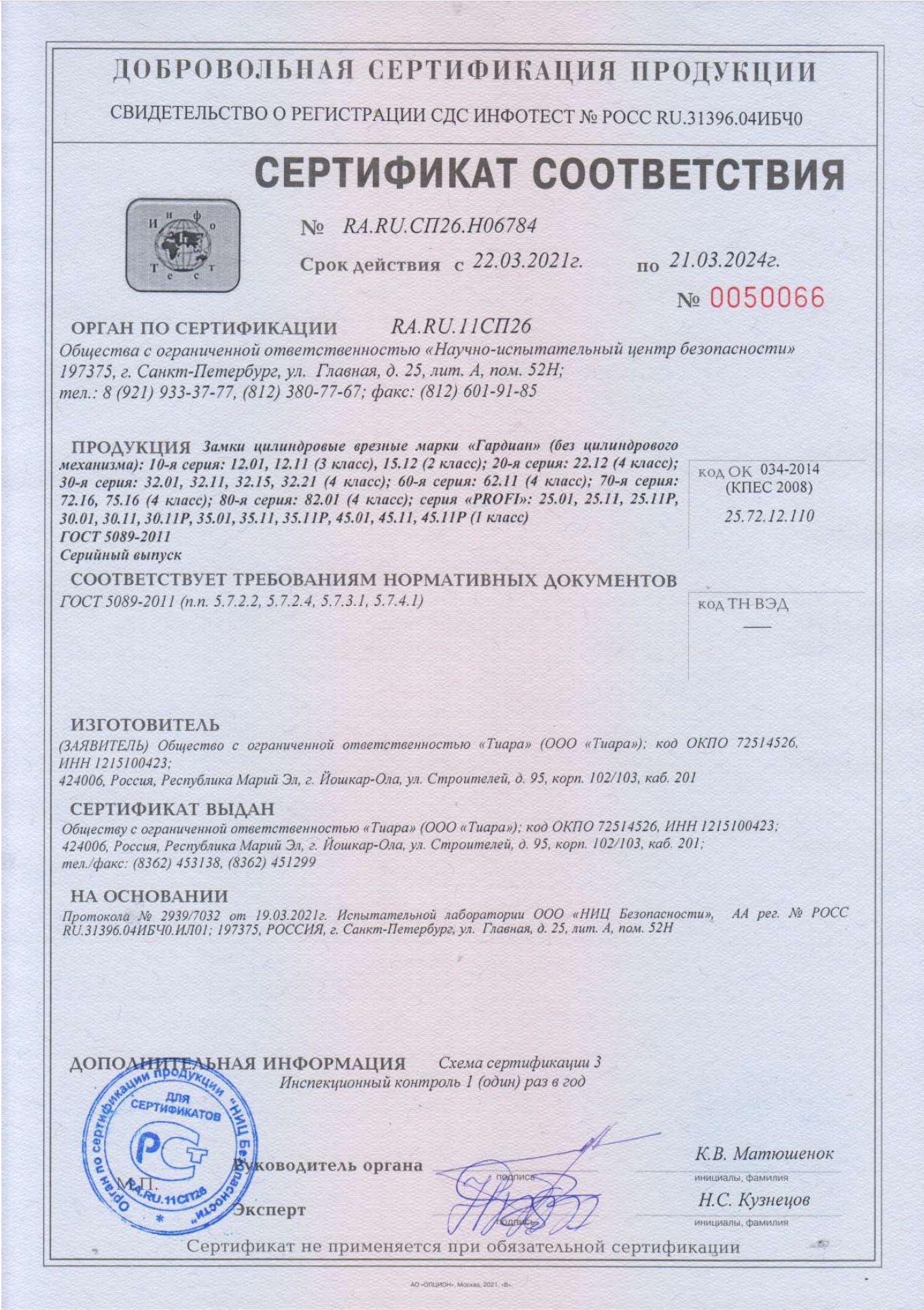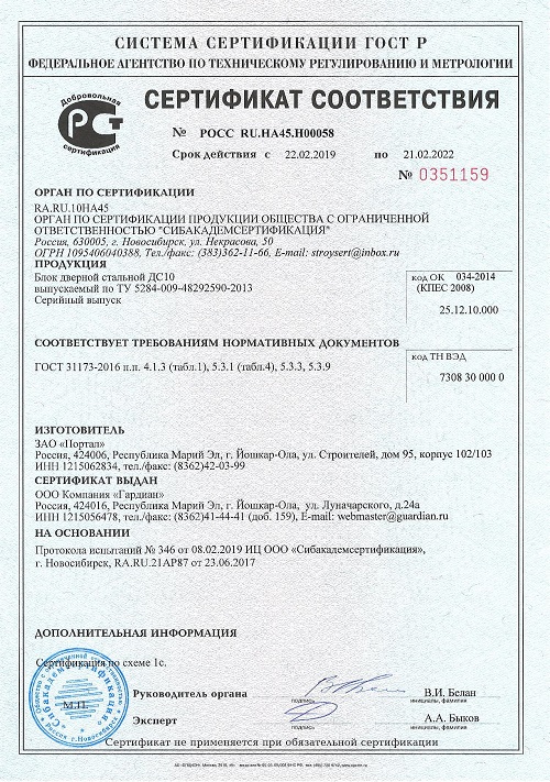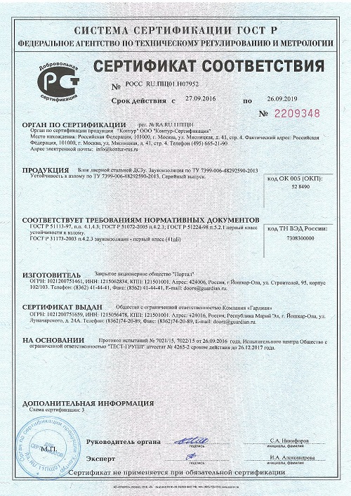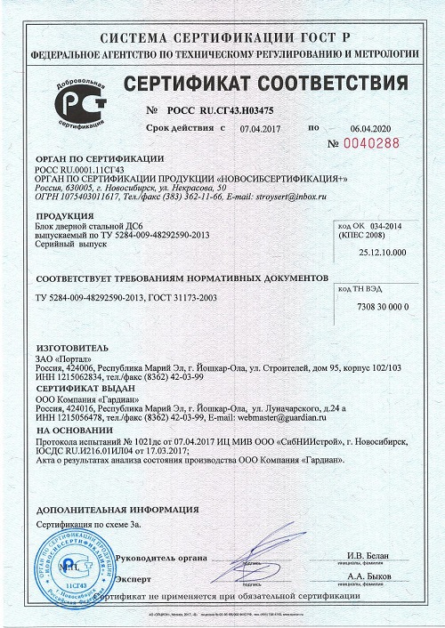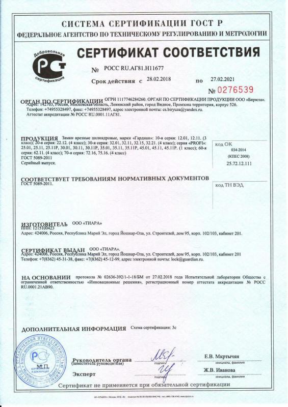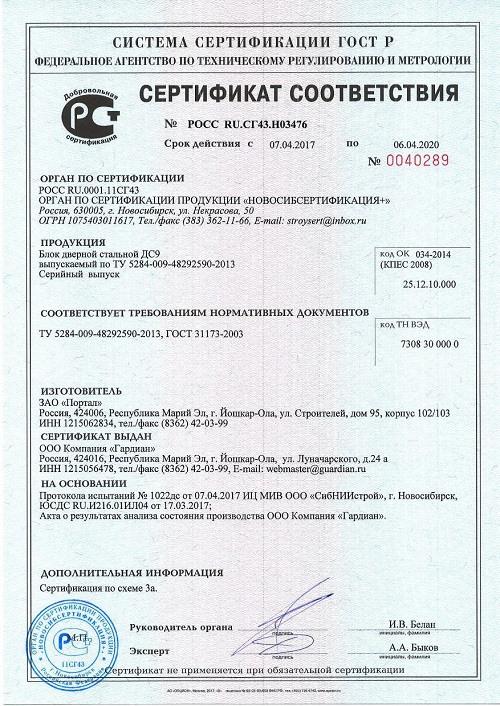 Завод Гардиан стремится выпускать современные двери с характеристиками высокого класса. Уровень соответствия заявленных характеристик можно проверить только отправив изделия на сертификацию. Поэтому у дверей и замков Гардиан есть целый портфель сертификатов, которые являются дополнительным доказательством высокого качества. Кроме сертификатов мы можем предоставить патенты на изобретения, награды за участия в различных выставках федерального и международного значения.