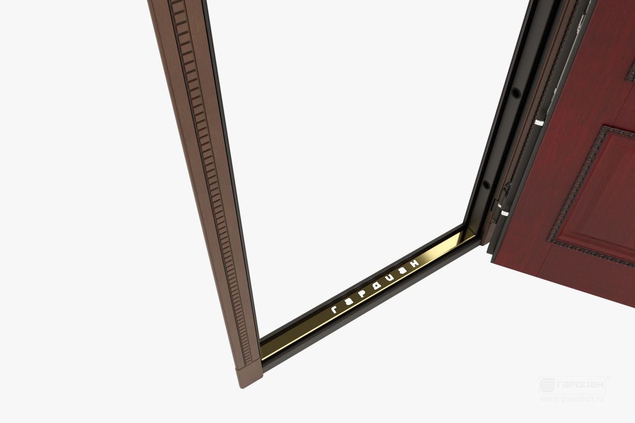 Стильный накладной порог с логотипом «Гардиан» из полированной нержавеющей стали с подсветкой придает двери элегантный вид и препятствует повреждению покрытия металла дверной коробки.