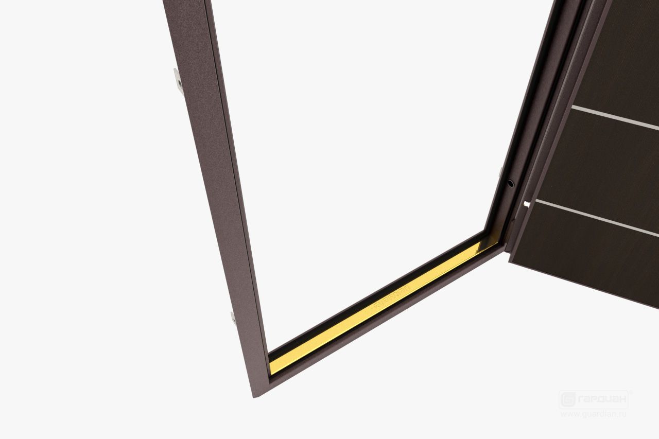 Стильный накладной порог с логотипом «Гардиан» из полированной нержавеющей стали или полированной латуни придает двери элегантный вид и препятствует повреждению покрытия металла дверной коробки.