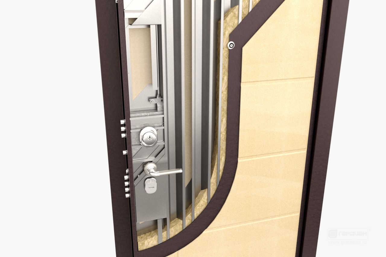 Возможность установки бронепакета с защитой замочной зоны дверного полотна и коробки, запирающих механизмов замков и замочных скважин, позволяет повысить защищенность двери до уровня дверей бизнес класса.
