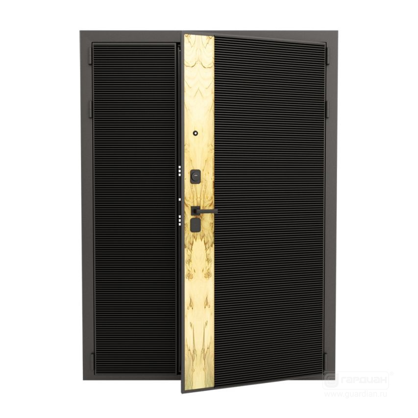 Конструкция из 3 вертикальных профилей (по форме «Трапеция») по всей высоте дверного полотна для увеличения устойчивости двери к деформации и вспарыванию при силовом взломе и взломе разрушающим методом.