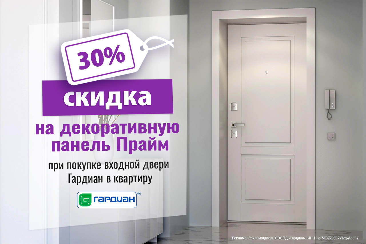 - Акция распространяется на все заказные квартирные двери Гардиан с панелью Прайм К на основе MDF толщиной 6 или 16 мм в крашеном исполнении.